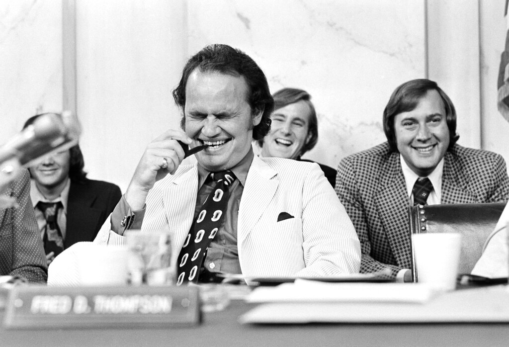 Fred Thompson, minority counsel, laughs during a session of the Senate Watergate Committee in Capitol Hill, July 23, 1973. Gordon Strachan, a former White House aide, had just told the committee that his advice to persons thinking of working for the government was to "stay away." Others are unidentified. (AP Photo)