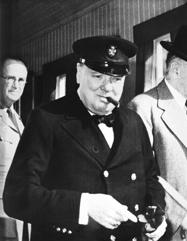 British Prime Minister Winston Churchill strikes typical pose, complete with smile, cigar, and sailor cap, as he comes out on the steps of the Citadel in Quebec on August 12, 1943, on his second visit to Canada since the start of the war. (AP Photo)