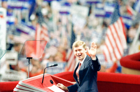 Sen. Dan Quayle waves from the podium at the Republican National Convention in New Orleans on Thursday, August 18, 1988 as he accepted the Republican Vice presidential nomination. (AP Photo/Bob Daugherty)