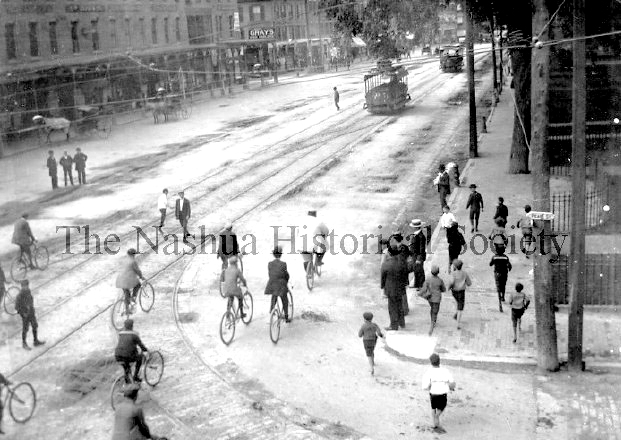 Men of various ages are seen leisurely riding their bicycles south along Main Street near the intersection of Pearl Street around the turn of the 20th century, shortly before the street was designated East Pearl and West Pearl streets. At the time this photo, which is part of the Nashua Historical Society’s Frank Ingalls collection, was taken, there were an estimated 1,200 to 1,500 cyclists in Nashua, most of whom belonged to one or more of the three clubs active at the time: the Nashua Wheel Club, the Riverside Club, and the Nashua Cycle Club. Each had their own clubhouse. They sponsored special ‘Bicycle Day’ events, which included races, parades and trick-riding demonstrations and typically attracted hundreds of riders and thousands of spectators.