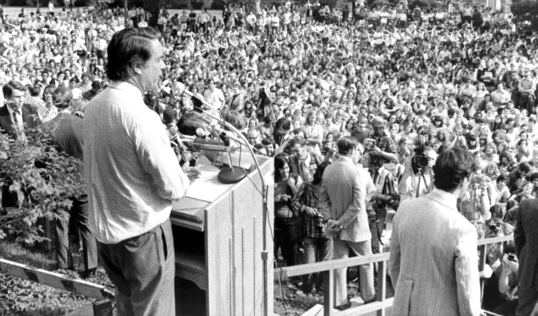 Shown in photo is Sargent Shriver, Democratic vice presidential candidate, speaks at a rally on the campus of Missouri University, Sept. 8, 1972 in Columbia, Mo. (AP Photo/William Straeter)