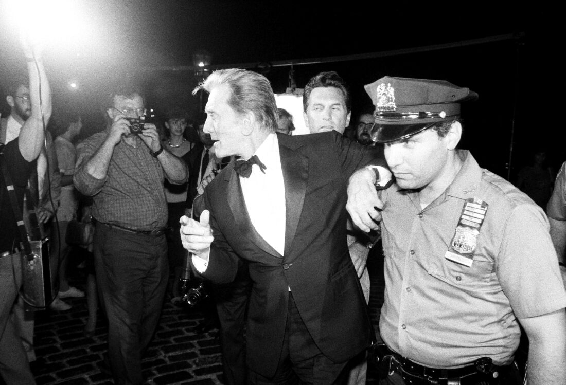 Actor Kirk Douglas is escorted from the set by a police officer after taping an "I Love New York" commercial under the Brooklyn Bridge on Sept. 4, 1985 in New York. When asked why he did the commercial, Douglas said "I love the city, the country and the state. Why wouldn't I do it, I'm from Amsterdam, New York." (AP Photo/Mario Cabrera)