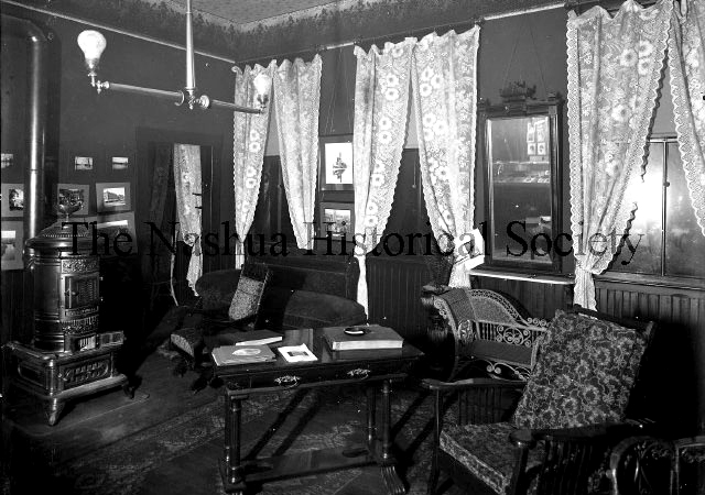 (Courtesy of NASHUA HISTORICAL SOCIETY) Curtains, tables with books, a mirror and different styles of chairs are among the props in the studios of prolific Nashua photographer Frank M. Ingalls, which, when this photo was taken in 1899, occupied rooms at 63 Main St., an address that no longer exists but was probably on the west side of Main Street between the Nashua River and Water Street. Note the coal-burning stove and the overhead gas lights that warmed and lighted the room. Many of Ingalls' images, some taken in this studio but many others that he photographed around town and in a number of other cities and towns, now belong to the Nashua Historical Society's Frank M. Ingalls Collection.
