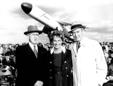 Jimmy Stewart, the film star from Indiana, Pa., returned to his hometown in Indiana, Pennsylvania on Sept. 19, 1959 for dedication of an airport in his honor. Posing with him are his father, Alex, 87, an Indiana businessman, and his wife, Gloria. Air Force missile is in background. (AP Photo)