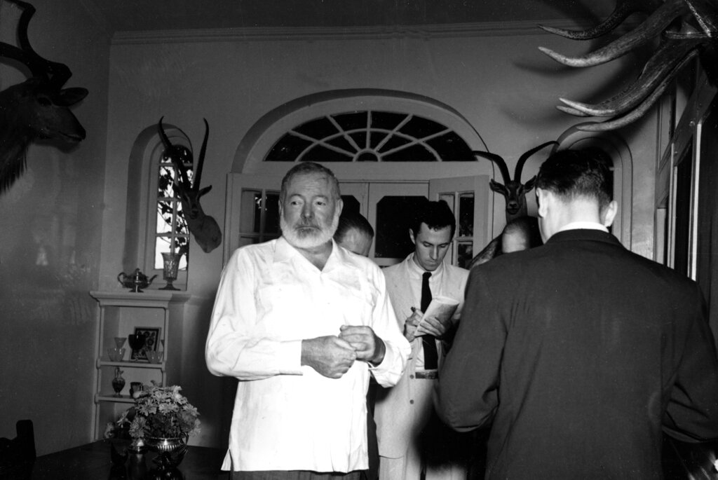 American novelist Ernest Hemingway meets the press at his Cuban home in San Francisco de Paula, a suburb of Havana, October 28, 1954, after announcement was made that he is awarded the 1954 Nobel Prize in literature. Hemingway said he "broke the training" and took a drink to celebrate the honor. Reporter seen at rear center is Sam Summerlin of the Associated Press. (AP Photo)