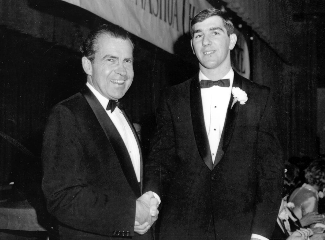With politics on our minds as we draw ever nearer to the much ballyhooed mid-term elections, a little trip down political memory lane turned up this photo, taken some 51 years ago right here in Nashua. The occasion was President Richard Nixon’s visit at the invitation of the Greater Nashua Chamber of Commerce to its annual dinner, at which Nixon was the keynote speaker. He was photographed meeting Greg Landry, the Nashua High and University of Massachusetts stellar quarterback who went on to play several years at QB for the Detroit Lions.