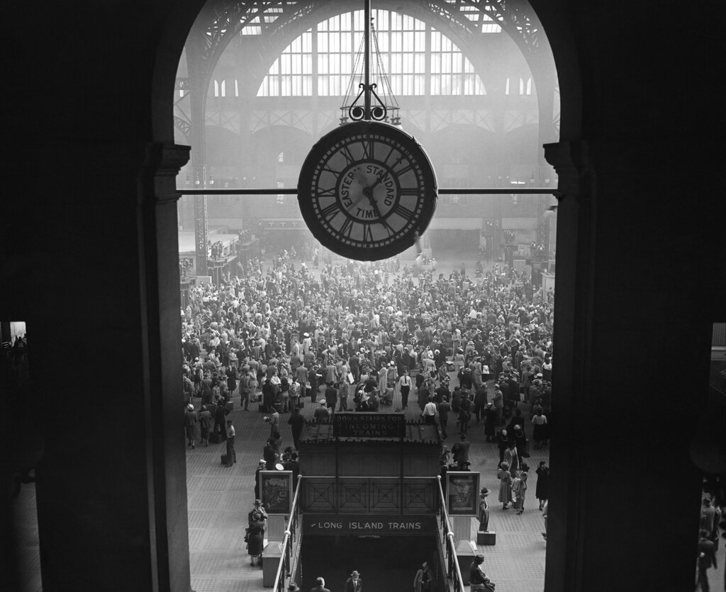 A large group of people at Penn Station, waiting for transportation for the long Memorial Day weekend, amass around the gates leading to their trains in New York, May 28, 1948. (AP Photo/Matty Zimmerman)