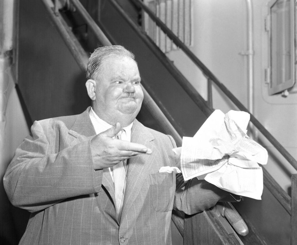 Oliver Hardy puts a check on Stan Laurel to make sure Stan arrives safely in England, Jan. 20, 1952 where the pair will tour for seven months. Sailing from New York on the Queen Mary, it will be Stan's thirteenth trans-Atlantic crossing and Oliver's seventh. The comedians, partners for 25 years, last toured Great Britain in 1947. (AP Photo)