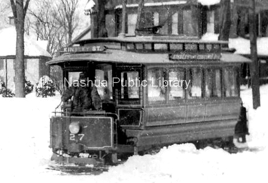 (Courtesy of NASHUA PUBLIC LIBRARY) Car 27 was evidently assigned to the Kinsley Street route on this snowy day back around the turn of the 20th century. It's believed this photo was taken near the intersection of Main and Kinsley streets.