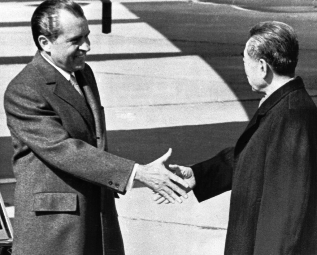 American President Richard Nizon, left, reaches out to shake the hand of Chinese Premier Chou En-Lai, at Peking Airport, on Feb. 21, 1972, after the President landed. (AP Photo)