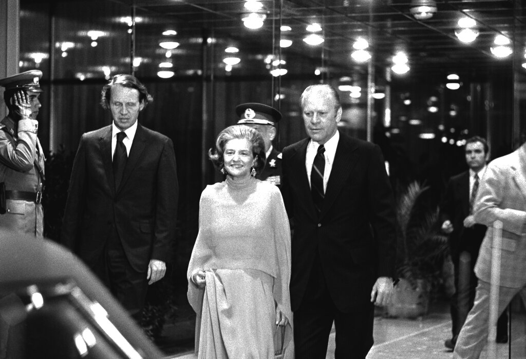 U.S. President Gerald Ford, right, and Mrs. Betty Ford, center, leave the Palace of the Republic after attending a dinner given by Romanian president Nicolae Ceausescu August 3, 1975 in Bucharest, Romania. (AP Photo)
