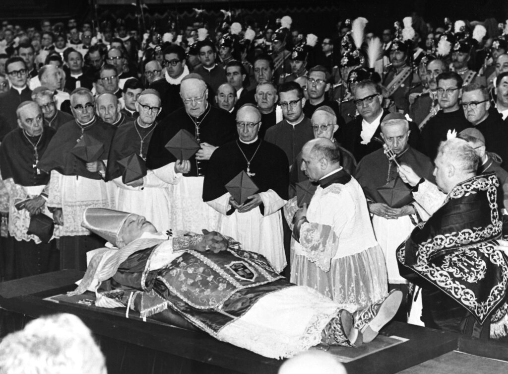 Archbishop Pericle Felici, right, of the Vatican Ceremonial Congregation, assisted by the Rev. Fantilume, gives the absolution over the body of Pope John XXIII in St. Peter's Basilica, Vatican City on June 4, 1963. The body of the 81-year-old pontiff, who died on June 3, 1963, had been carried across St. Peter's Square from the Apostolic Palace for the lying in state before the Basilica's main altar. In the background, from left, are: Cardinals Francesco Morano, Arcadio Larraona Saralegui, Francesco Bracci, Augustin Bea, William Theodore Heard, Michael Browne, Joaquin Albareda, Valerio Valeri, partly obscured by Rev. Fantilume and Fernando Cento. (AP Photo)