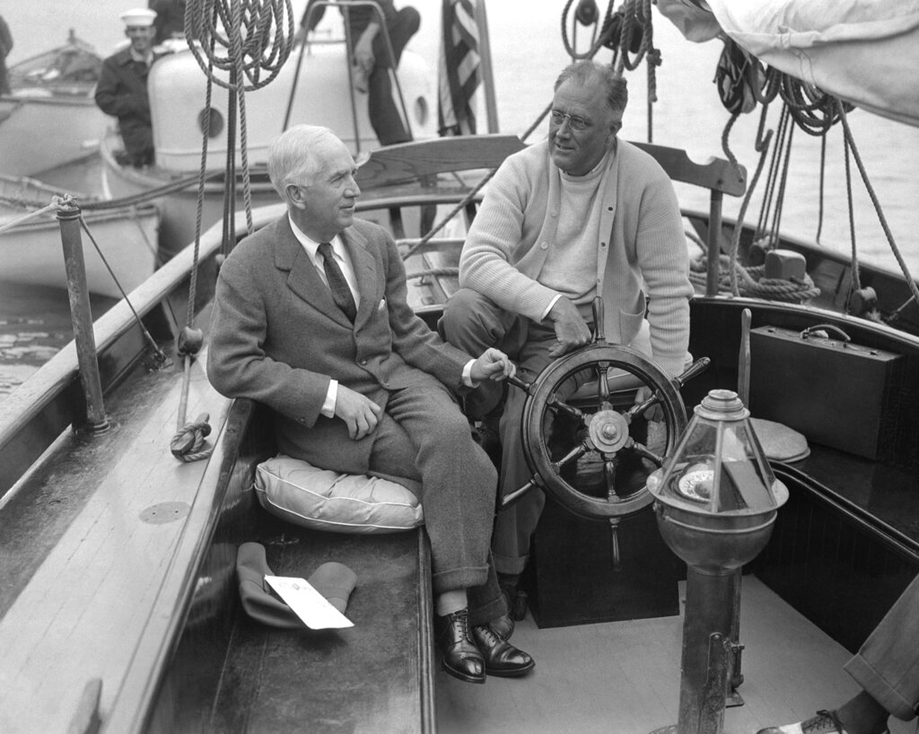President Franklin D. Roosevelt is shown aboard the Amberjack II at Lakeman Bay, Maine, with his Ambassador-at-Large Norman H. Davis, as they conferred on the Geneva Disarmament Conference, June 28, 1933. (AP Photo)