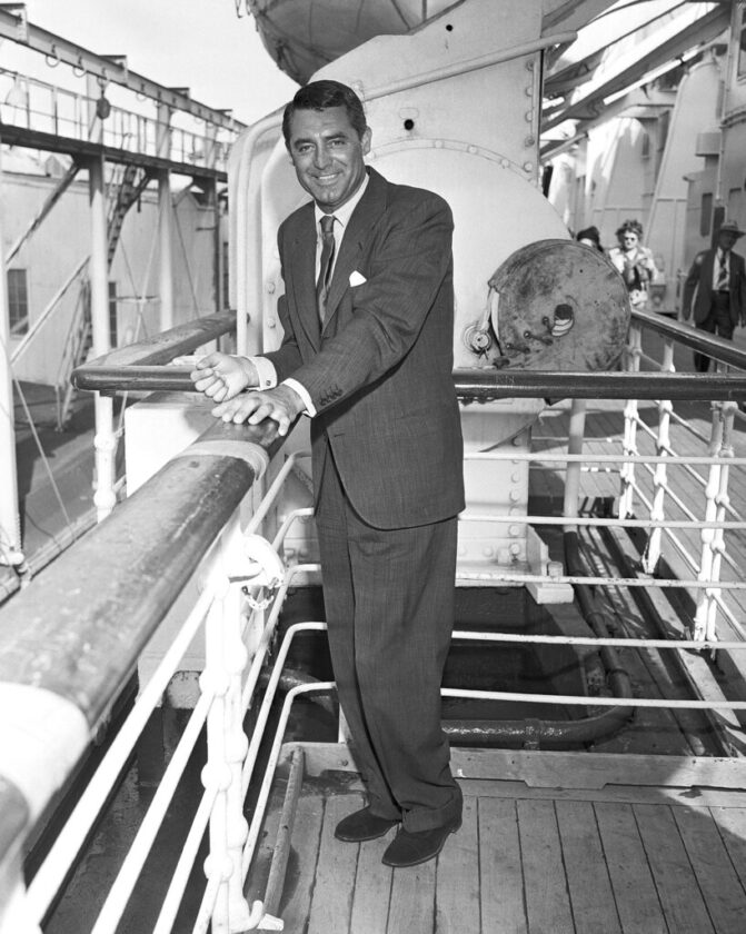 Actor Cary Grant sails from New York aboard the Cunard White Star Liner Queen Elizabeth for England to arrange for reproduction there of some pictures in which he will star on Aug. 1, 1947. Grant, a friend of Howard Hughes, told reporters that he attended many parties given by the airplane manufacturer, but that none of them were connected with politics or government contracts as far as he knew. (AP Photo)