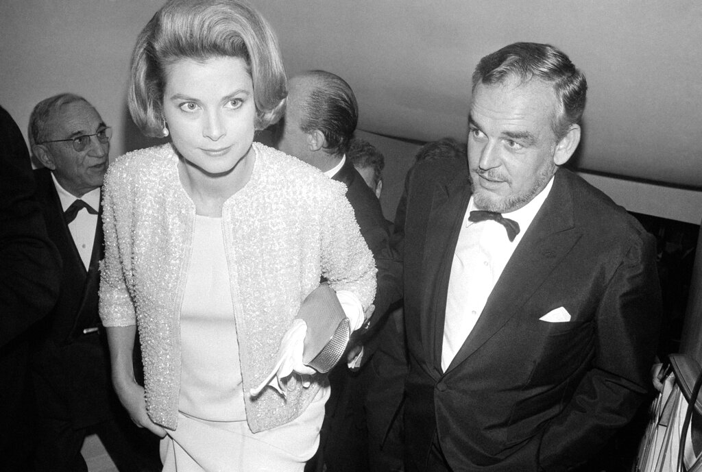 Princess Grace of Monaco and Prince Rainier III arrive at Marigny theatre to attend the Night of the Cinema Gala in Paris on Oct. 29, 1965. (AP Photo/Jacques Marqueton)