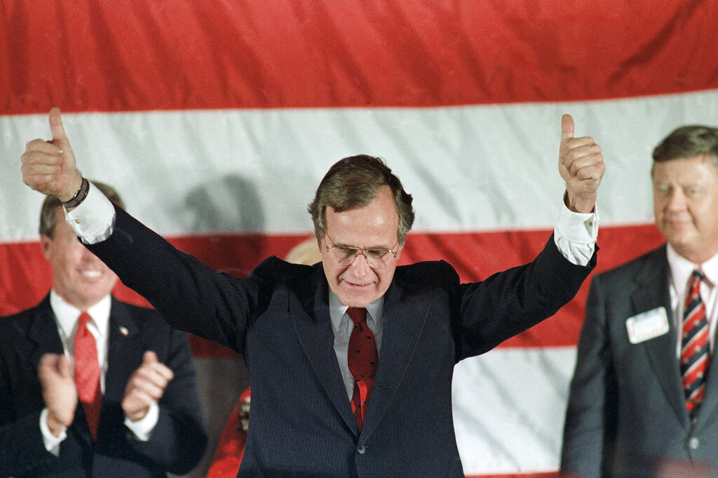 George H. Bush gives the thumbs, Nov. 7, 1984 as he is greeted by a crowd of cheering supporters. (AP Photo/David Breslauer)