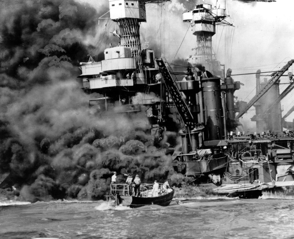 As heavy smoke rolls out of the stricken USS West Virginia, a small boat rescues a crew member from the water after the Japanese bombing of Pearl Harbor, Hawaii, Dec. 7, 1941 during World War II. Two men can be seen on the superstructure, upper center. The mast of the USS Tennessee is beyond the burning West Virginia. (AP Photo)