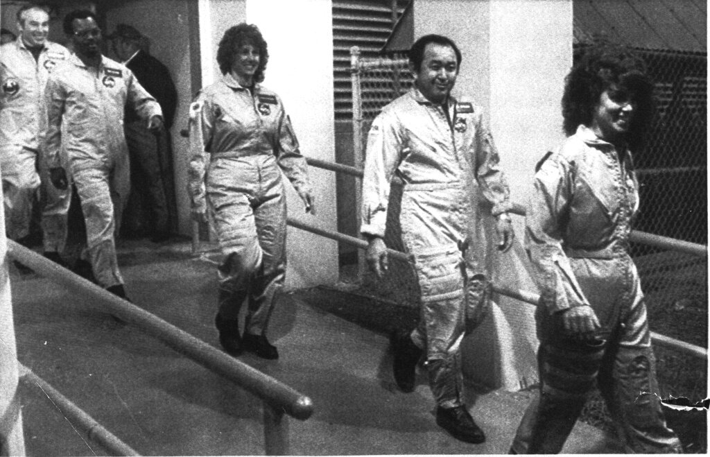 Space Shuttle Challenger crew members walk to the astronaut van for transport to the launch area, Jan. 8, 1986, during a practice run. From left: payload specialist Gregory Jarvis; mission specialist Ronald McNair; the first teacher astronaut Christa McAuliffe; mission specialist Ellison Onizuka; and mission specialist Judith Resnik. (AP PhotoPaul Kizzle)