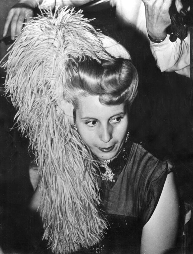 Evita Peron, wife of Argentine President Juan Peron, wears an extravagant hat at a dinner party at the Agua Santa Club in Rome, Italy on July 12, 1947. (AP Photo) --- Eva Peron, die Witwe des argentinischen Praesidenten, auf einer Dinnerparty am 12. Juli im Agua Santa Club in Rom waehrend ihrer Europareise 1947. (AP Photo)