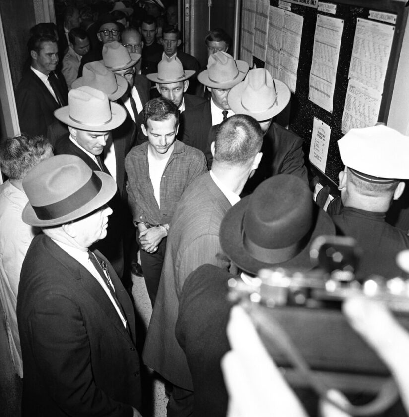 Lee Harvey Oswald, center, is shown in custody at a Dallas police station, Nov. 23, 1963. Oswald is accused in the assassination of President John F. Kennedy. Others are unidentified. (AP Photo)