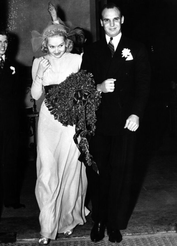 Jackie Coogan, famous as the kid in Charlie Chaplin films, and his bride, Betty Grable, Hollywood starlet, are leaving St. Brendans Church, at Los Angeles in a shower of rice after their wedding on Nov. 29, 1937. Film work was expected to cut short their honeymoon. (AP Photo)