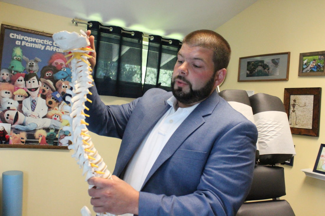 Photo by Hannah LaClaire A model of the human spine, which Nashua chiropractor Brandon Linatsas uses to discuss proper spinal alignment with his patients.