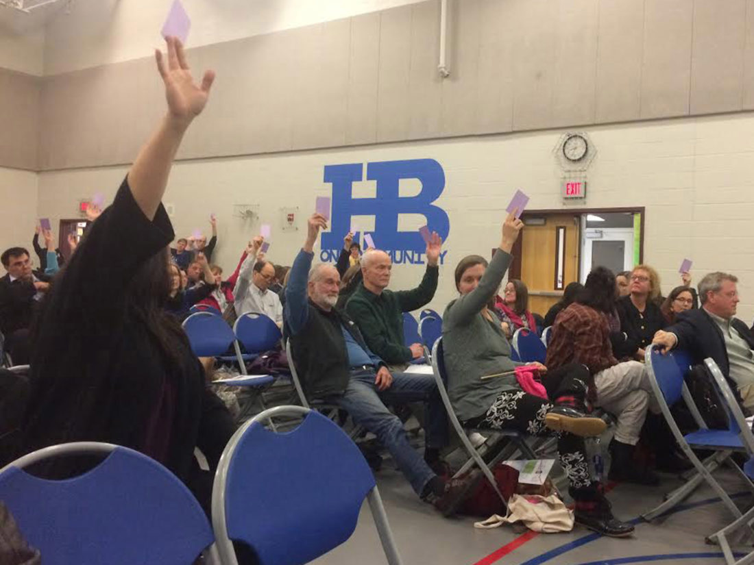 Staff photo by Derek Edry Hollis voters approve the energy conservation lease purchase for its elementary schools March 7 during the Hollis School District Annual Meeting.