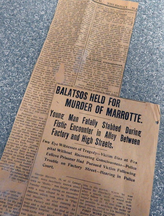 This time the culprit was a particularly eye-catching headline jumping off a brittle, yellowed newspaper page: “Balatsos held for Murder of Marrotte.”