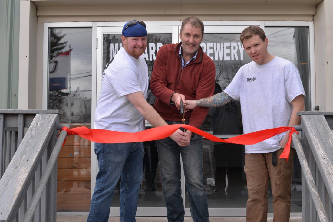Staff photo by Adam Urquhart Dean Baxter, center, cuts the red ribbon to celebrate the grand opening of Millyard Brewery’s new location with the help of Ken Unsworth, left, and Matthew Hart.