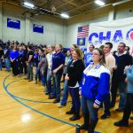 Photo by LORETTA JACKSON Justin Spencer, left, founder of Recycled Percussion junk rock band, and Ryan Vezina, both New Hampshire natives and stars of “Chaos & KIndness,” an Emmy-nominated TV show, recently surprised students at Merrimack High School with a visit that was a secret kept by administrators until everyone was beckoned to the school gym by the Las Vegas celebrities.