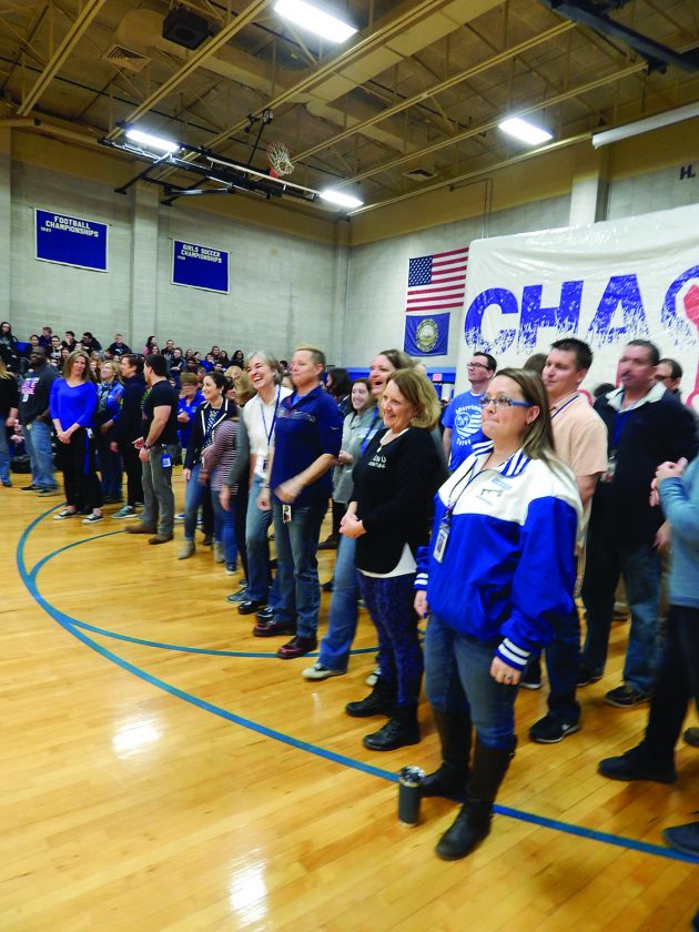 Photo by LORETTA JACKSON Teachers and staffers responded to an invitation from Recycled Percussion musicians Justin Spencer and Ryan Vezina, stars of Chaos & Kindness television show, who upon completing a surprise performance at MHS, called the educators to come forth for thankful recognition, a kudo followed by Spencer’s launch of an impromptu dance contest that gave each honoree a quick chance to bust some moves.