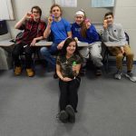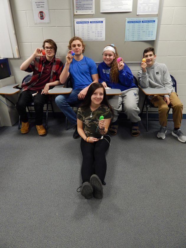 Photo by LORETTA JACKSON A giveaway totalling $500 in charity-bound funds that were donated by Chaos & Kindness and hidden in plastic eggs in the MHS gym and elsewhere, was retrieved by students including these MHS members, from left, Christopher Bailey, a senior; Zach Twardosky, a junior; Jordan Morgan, a freshman; and Anthony Maglio, a sophomore, along with Hallie Neve, seated, a junior.
