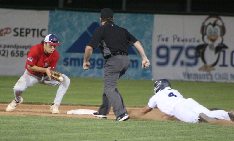 Silver Knights infielder and Finals MVP Jack McDermott handles the throw but not in time to stop Vermont’s Tommy Martin from stealing second during Friday nights FCBL title game at UVM’s Centennial Field. (Telegraph photo by TOM KING)