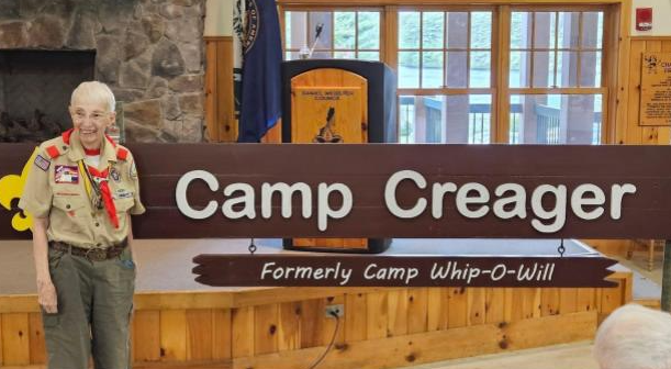 What greater honor, therefore, than to rename the camp in her honor. Creager was shocked and thrilled when the new overhead entrance sign was revealed. For decades to come scouts will be greeted with this beautiful sign welcoming them to Camp Creager. The sign was designed and built by Assistant Scoutmaster David Gailus of Merrimack.