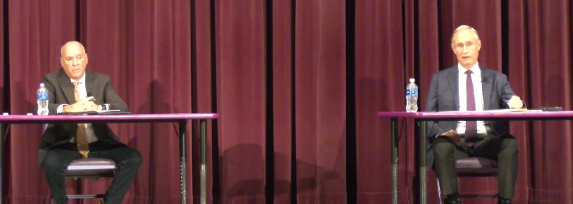 Mayor James Donchess (right) and Hillsborough County Commissioner Michael Soucy faced off in their final debate before the Nov. 7 election. Courtesy photo/Nashua Community Television