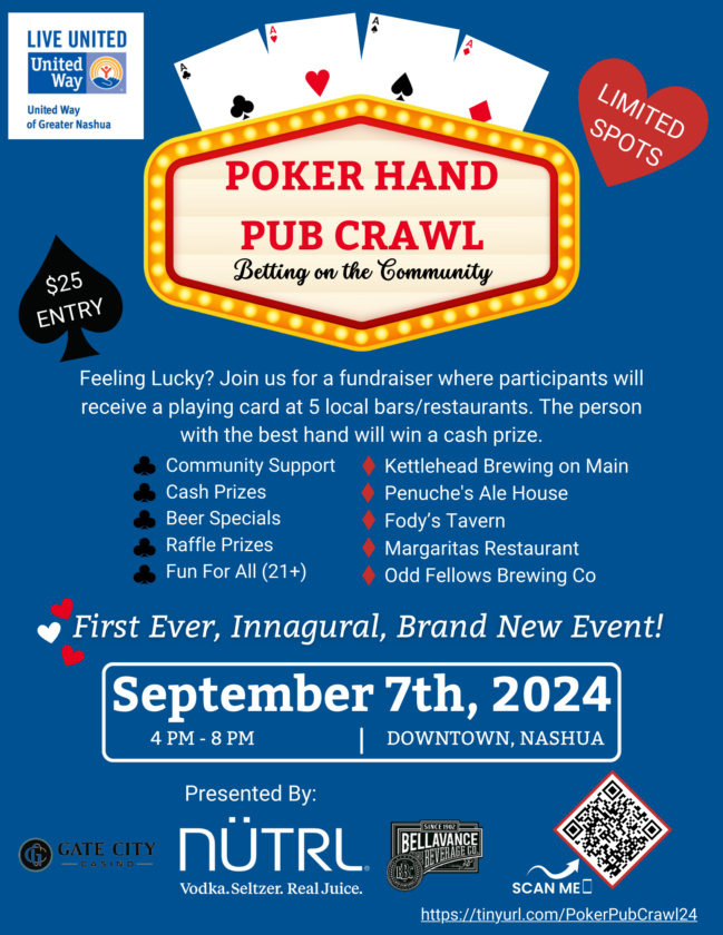 The inaugural Poker Hand Pub Crawl will support the United Way’s ongoing initiatives, which include programs focused on education, financial stability and health — the building blocks of a good quality of life. By participating, attendees contribute directly to the well-being of their neighbors, ensuring that everyone in Greater Nashua has access to the resources they need to thrive.