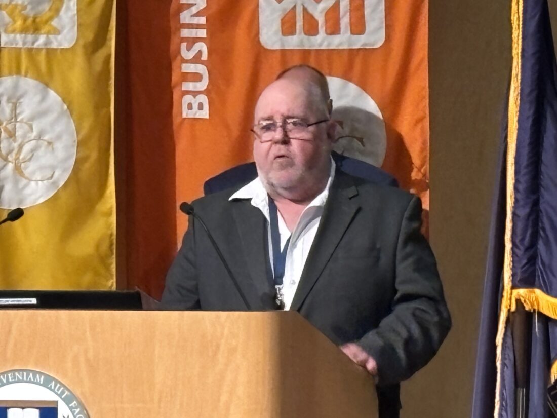 Boot camp instructor James Flis delivers his remarks during the April 23 graduation of the 36th Cohort of the Microelectronic Boot Camp at Nashua Community College. Telegraph photo by CHRISTOPHER ROBERSON