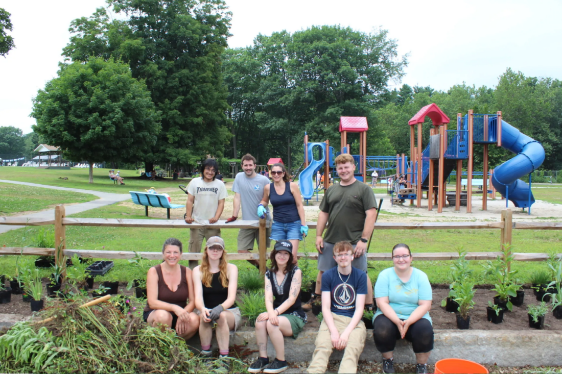 The core group of volunteers credited with beautifying the community through the establishment of a series of enticing pollinator gardens include locals, standing from left, Drew West, Griff Comtois, Beth Comtois and Brent McHale, seen here with associates, foreground from left, Christine Schwab, Ryleigh Schwab and Xoey Teixeira, Landyn Crocker and Ari Frankel. Courtesy photo