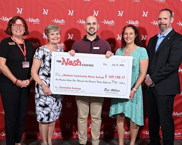 - Shown from left The Nash Director of Communications & Charity Christine Latino, Nashua Community Music School Chair of the Board Donna Kraus, Assistant Director Cody Switzer, Executive Director Lindsay Rinaldi and The Nash Director of Security Robert Page. Courtesy photo/The Nash Casino