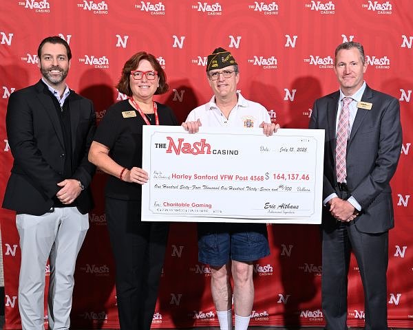 - Shown from left is The Nash Assistant General Manager Aaron Feinberg, The Nash Director of Communications & Charity Christine Latino, Harley Sanford VFW Post 4368 Quartermaster Douglas Cave and The Nash General Manager Eric Althaus. Courtesy photo/The Nash Casino