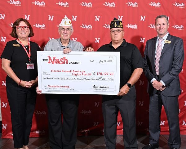 - Shown from left is The Nash Director of Communications & Charity Christine Latino, Stevens Buswell American Legion Post 54 Adjutant John Graham, Steven Brochu and The Nash General Manager Eric Althaus. Courtesy photo/The Nash Casino