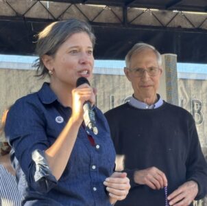 As Mayor James Donchess looks on, Congresswoman Maggie Goodlander (D-NH) speaks to families during this year's Nashua Goes Back To School event on Aug. 21 at Library Plaza. Telegraph photo by CHRISTOPHER ROBERSON