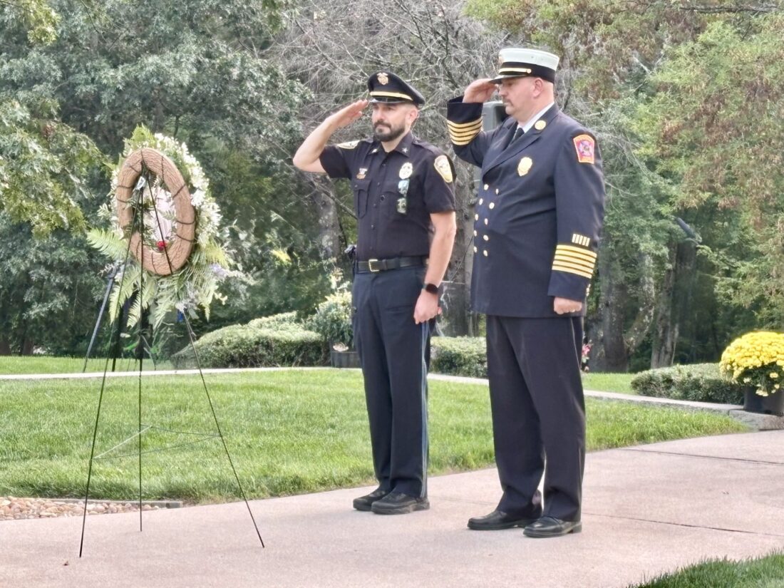 - Police Chief David Cayot (left) and Fire Chief Scott Tice salute the wreath placed at the 9/11 Memorial at Benson Park. Telegraph photo by CHRISTOPHER ROBERSON