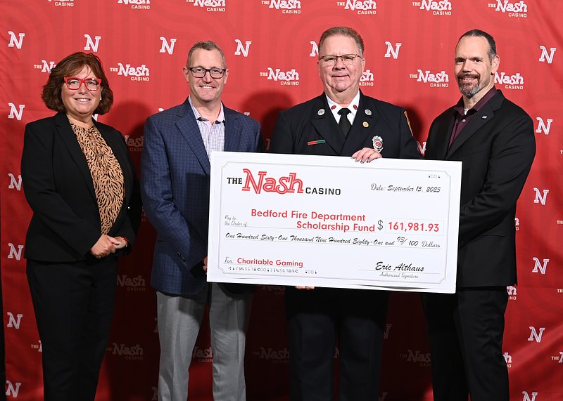 - Shown from left are The Nash Director of Communications and Charity Christine Latino, General Manager Eric Althaus, Thomas Green, president of the Bedford Fire Department Scholarship Fund and The Nash Director of Security Robert Page. Courtesy photo/The Nash Casino
