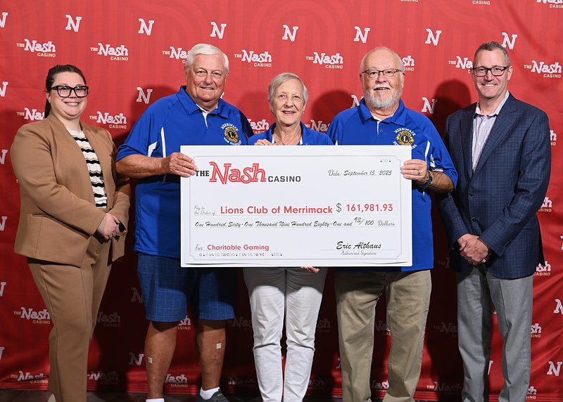 - Shown from left are The Nash Vice President of Marketing Heather Cook-Osolnick, Philip Przybyszewski, treasurer of the Lions Club of Merrimack, Club Secretary Rosemary Gagne, Fundraising Committee Chairman Alan Hoye and The Nash General Manager Eric Althaus. Courtesy photo/The Nash Casino