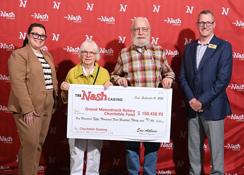 - Shown from left are The Nash Vice President of Marketing Heather Cook-Osolnick, Magaraet Monahan, chairwoman of the Grand Monadnock Rotary Charitable Fund Charitable Donations Committee, President William Frantz and The Nash General Manager Eric Althaus. Courtesy photo/The Nash Casino