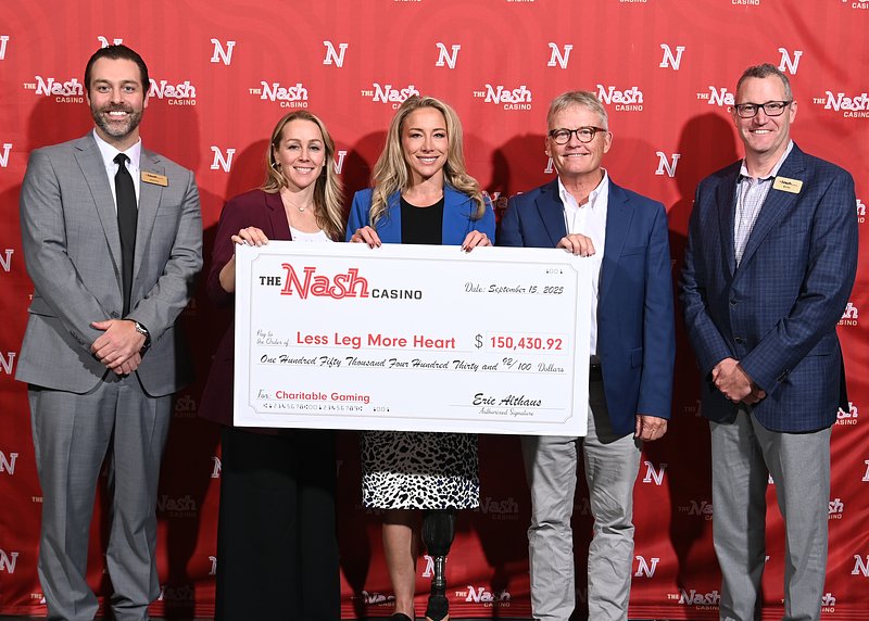 - Shown from left are The Nash Assistant General Manager Aaron Feinberg, Less Leg More Heart Board of Directors Chairwoman Kassandra Crosby, Executive Director Christina Hurley, Vice Chairman Dr. Michael Southworth and The Nash General Manager Eric Althaus. Courtesy photo/The Nash Casino