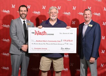 - Shown from left is The Nash Assistant General Manager Aaron Feinberg, Bedford Men’s Community Club President David Gilbert and The Nash General Manager Eric Althaus. Courtesy photo/The Nash Casino