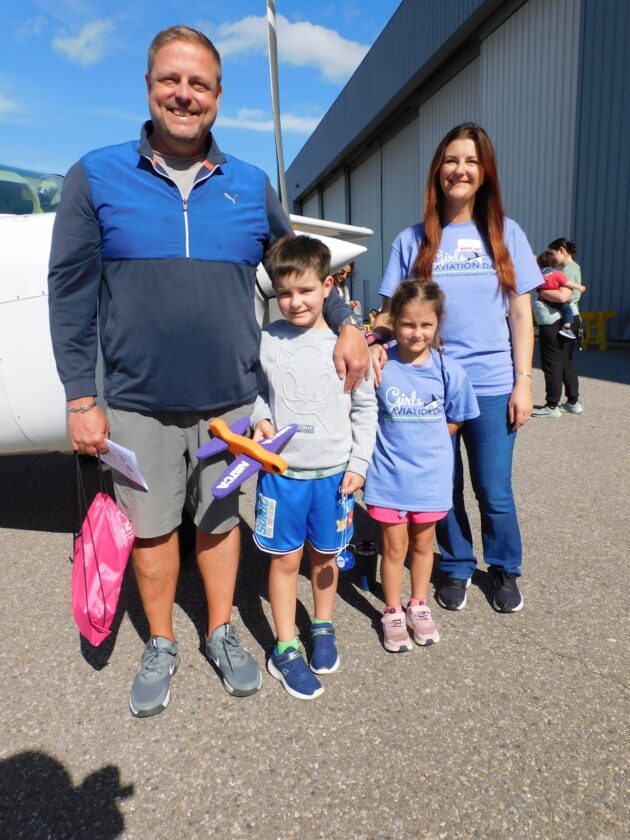 Milford aviation enthusiasts Michael and Kristen Lynch brought their young ones, Addison and Avery to the recent Girls in Aviation event where there was available a variety of aircraft to board, games and crafts to promote aviation careers and representatives from the military, from flying schools and from Nashua Community College, a local favorite that offers air traffic controller training. Photo by LORETTA JACKSON