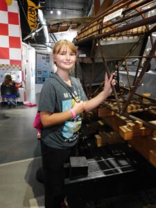 - Rylee Traxel of Nashua, whose mission at age 10 already is focused on becoming a pilot of military aircraft, admires as a part of the activities hosted during the recent Girls in Aviation Day at the Aviation Museum of New Hampshire in Londonderry, a 1929 aircraft — “The Doodle Bug,” which was the first biplane, a flying machine built in New Hampshire. Photo by LORETTA JACKSON